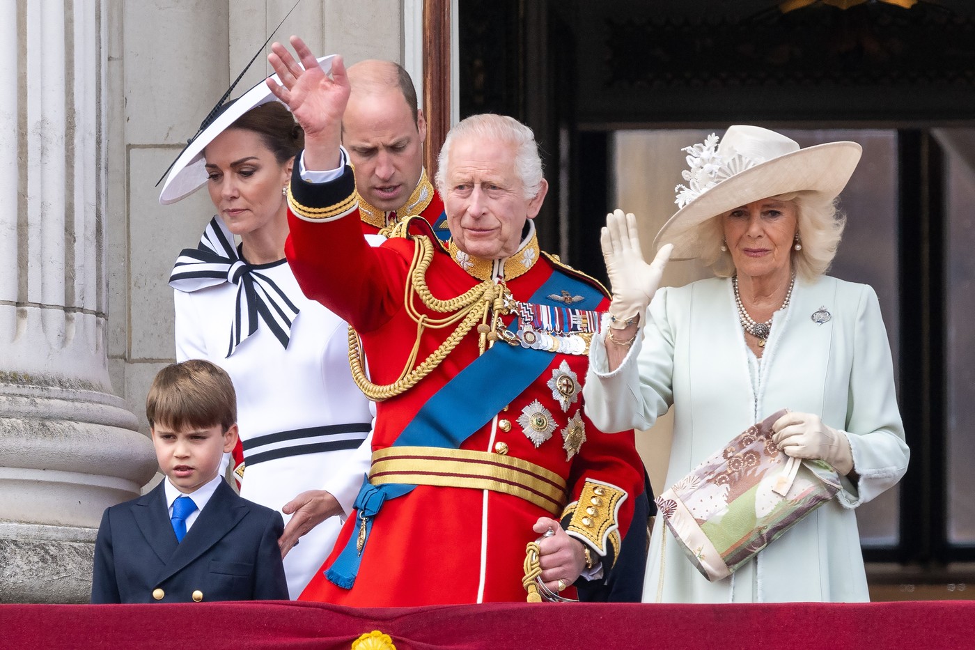 Prince William, Catherine Princess of Wales, Prince George, Princess Charlotte, Prince Louis, King Charles III, Queen Camilla on the balcony of Buckingham Palace attend Trooping The Colour to mark King Charles III Birthday