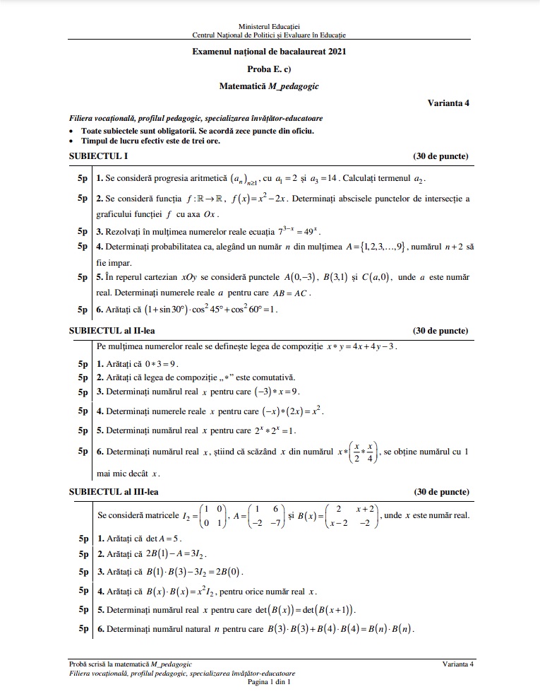 Subiecte Bacalaureat matematică, profil pedagogic
