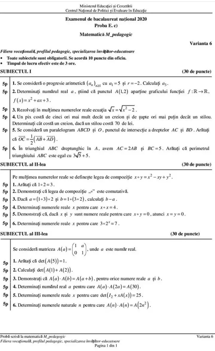Subiecte Matematică Bac 2020 – profil pedagogic