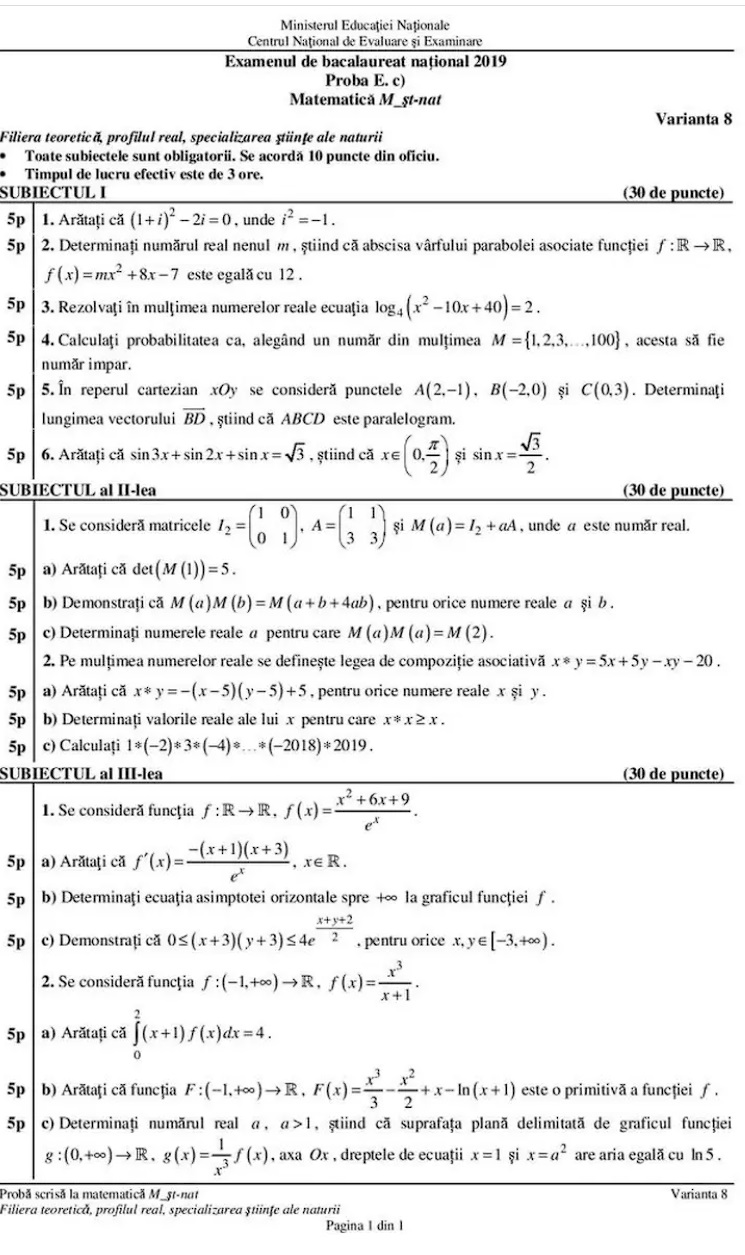 Subiecte Matematică Bac 2019 – profil științe ale naturii