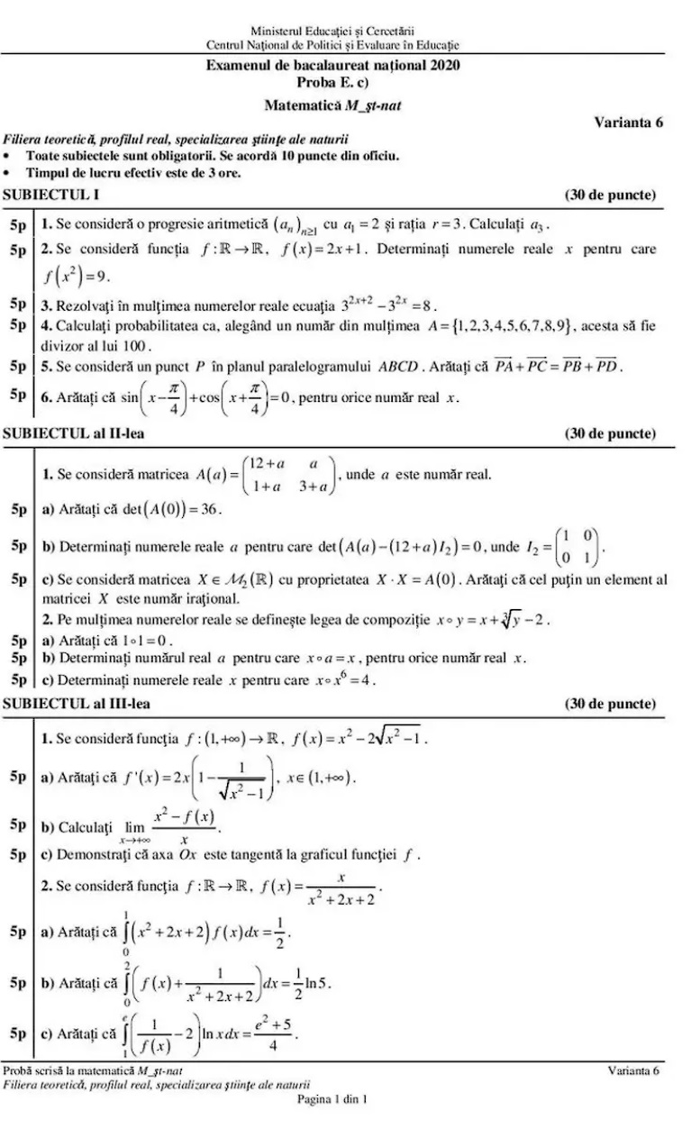 Subiecte Matematică Bac 2020 – profil științe ale naturii