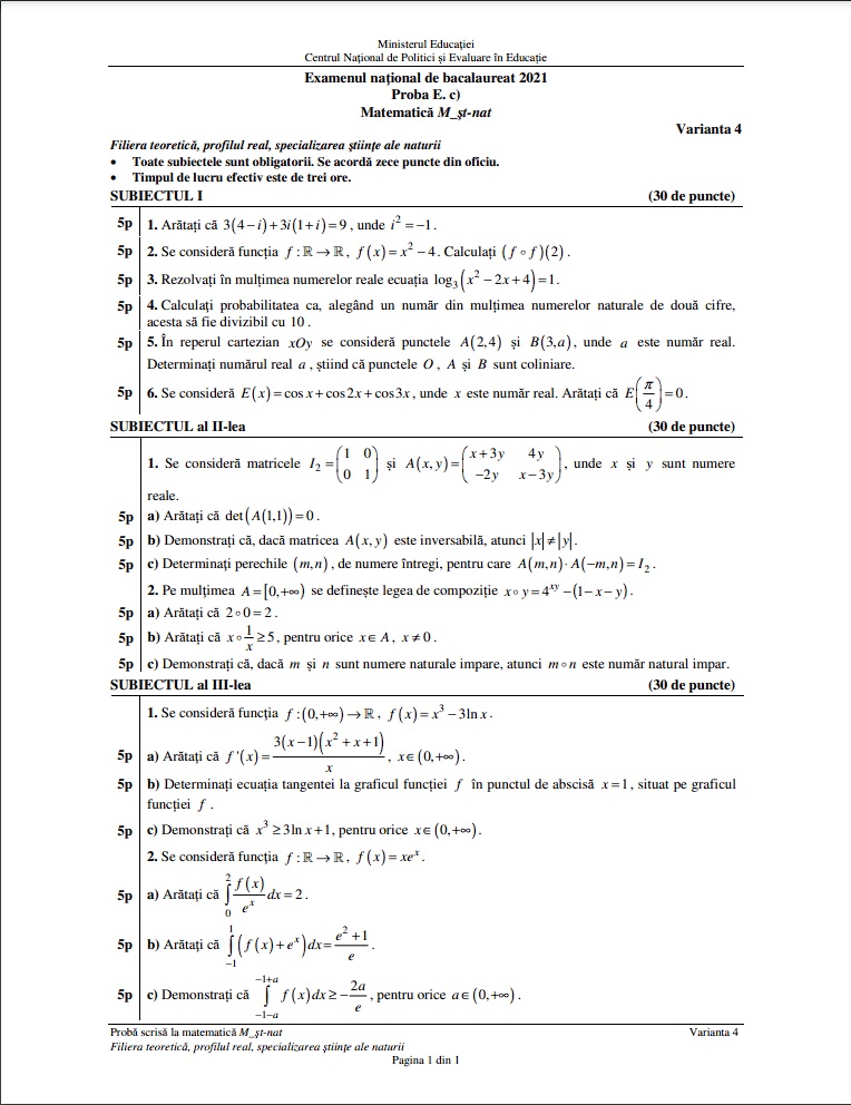 Subiecte Matematică Bac 2021 – profil științe ale naturii
