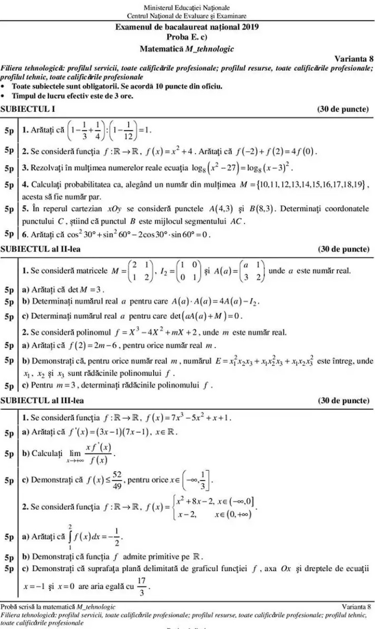 Subiecte Matematică Bac 2019 – profil tehnologic