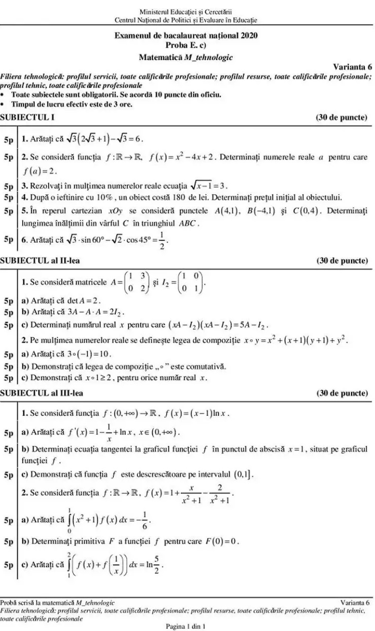 Subiecte Matematică Bac 2020 – profil tehnologic