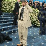 Colman Domingo a fost unul dintre cei mai eleganți bărbați de la Met Gala 2025. A purtat o ținută Valentino personalizată, cu o capa albastră, care a fost îndepărtată pentru a dezvălui un costum gri, negru și alb, cu texturi contrastante și o floare mare pe rever.