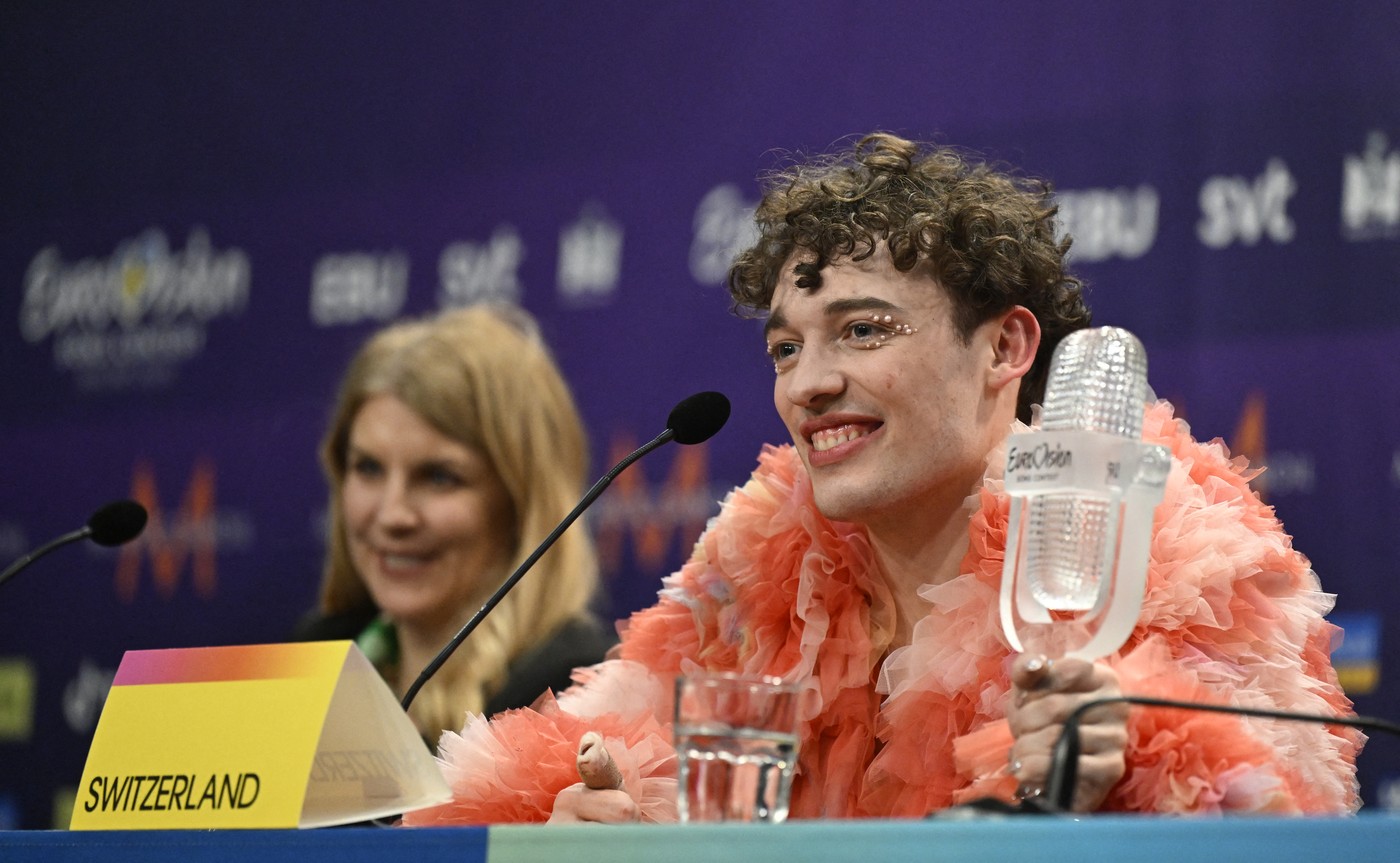 This year's winner Nemo, representing Switzerland, holds their trophy during a press conference after the final of the 68th edition of the Eurovision Song Contest (ESC) at Malmö Arena, in Malmö, Sweden, May 12, 2024. Switzerland's Nemo won the Eurovision Song Contest Saturday, the first artist identifying as non-binary to do so, in a contest marked by controversy over Israel's participation during the war in Gaza.,Image: 872127033, License: Rights-managed, Restrictions: Sweden OUT