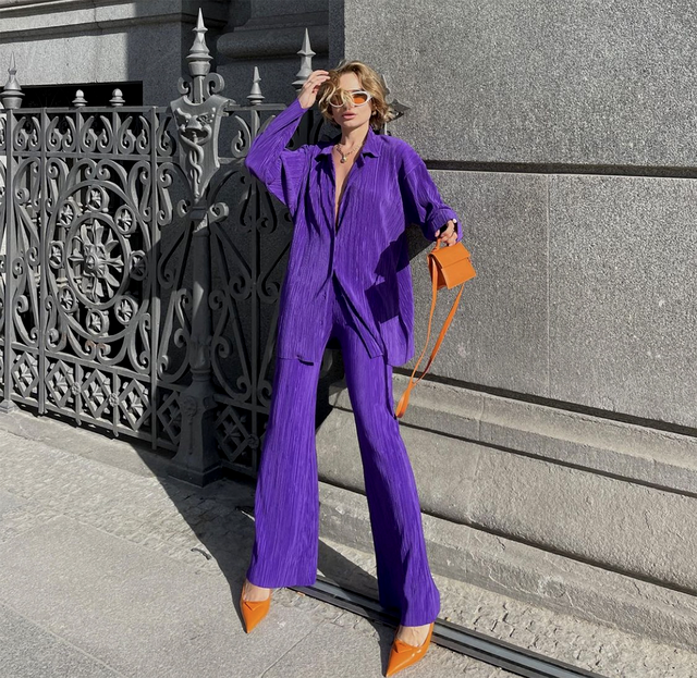 Mov și portocaliu: Aceasta este una dintre combinațiile favorite pentru multe celebrități și bloggeri de modă. Pentru a completa un outfit modern, mizează pe un look violet complet și accente portocalii.
