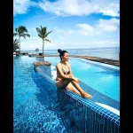Prezentatoarea știrilor sportive a optat pentru un costum de baie în două piese, cu sutien alb și un slip de culoare gri. Din bagajul său nu a lispit nici pălăria care să o protejeze de soarele puternic din Singapore, dar nici ochelarii de soare.