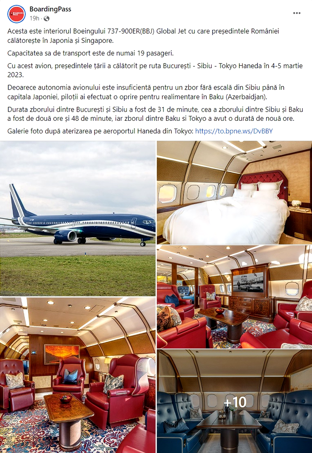 Aeronava cu care președintele a făcut deplasarea în Asia a zburat sâmbătă seara, 4 martie, din București până la Sibiu. De acolo, a decolat spre Japonia, însă a făcut escală la Baku, capitala Azerbaidjanului, pentru realimentare, întrucât „autonomia avionului este insuficientă pentru un zbor fără escală din Sibiu până în capitala Japoniei”, notează publicația Boarding Pass.