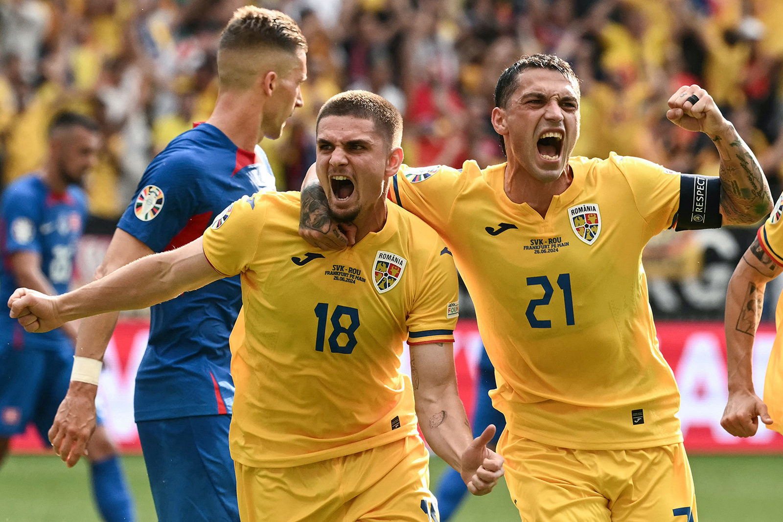 Romania's midfielder #18 Razvan Marin (L) celebrates with Romania's midfielder #21 Nicolae Stanciu (R) after scoring his team's first goal from the penalty spot during the UEFA Euro 2024 Group E football match between Slovakia and Romania at the Frankfurt Arena in Frankfurt am Main on June 26, 2024. (Photo by Angelos Tzortzinis / AFP) (Photo by ANGELOS TZORTZINIS/AFP via Getty Images)