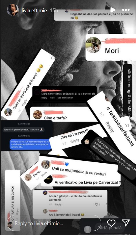 Livia Eftimie, făcută praf de internauți după ce l-a părăsit pe Cătălin Bordea și s-a cuplat cu Spike. Bruneta a publicat mesajele acide pe care le primește de la hateri