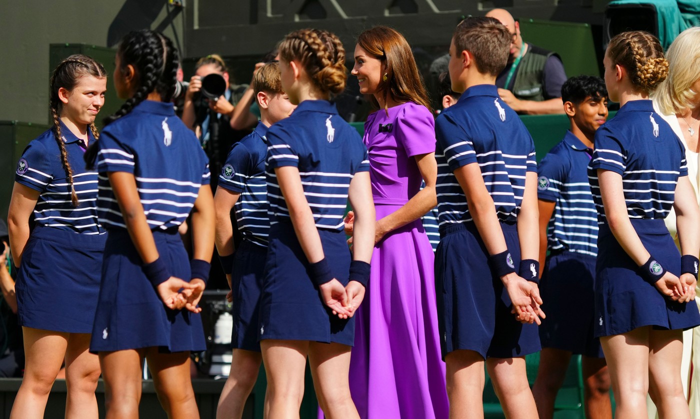 Catherine Princess of Wales greets ballboys and ballgirls