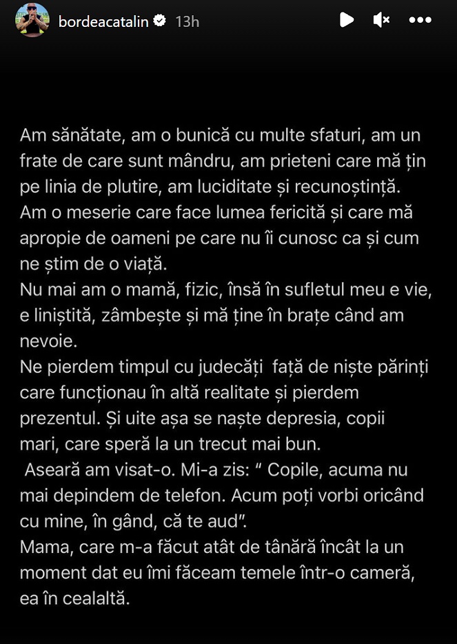 ”Am sănătate, am o bunică cu multe sfaturi, am un frate de care sunt mândru, am prieteni care mă țin pe linia de plutire, am luciditate și recunoștință. Am o meserie care face lumea fericită și care mă apropie de oameni pec are nu îi cunosc ca și cum ne știm de o viață. Nu mai am o mamă, fizic, însă în sufletul meu e vie, liniștită, zâmbește și mă ține în brațe când am nevoie.”, începe Cătălin Bordea mesajul plin de durere.
