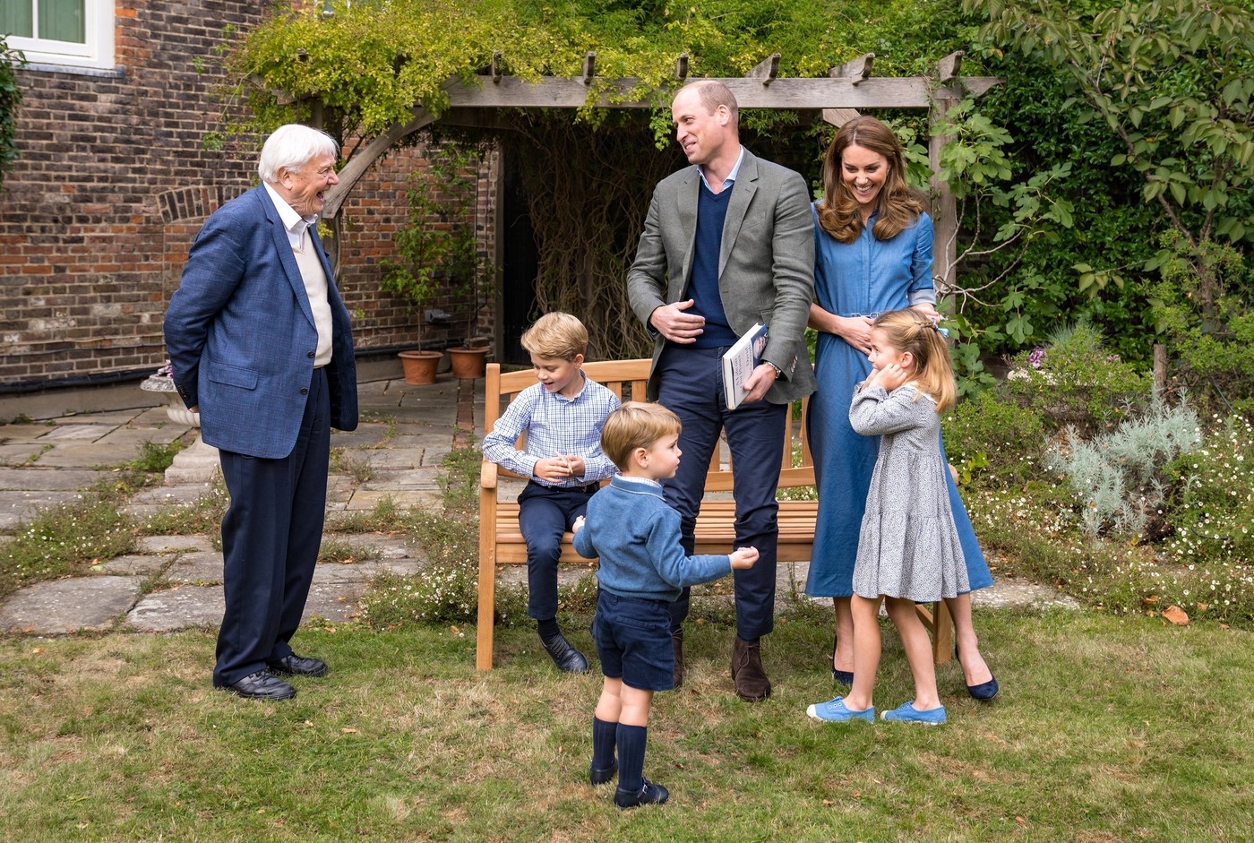 London, UNITED KINGDOM - The Duke and Duchess of Cambridge, Prince George, Princess Charlotte and Prince Louis meet Sir David Attenborough in the gardens of Kensington Palace, London UK, on the 27th September 2020.